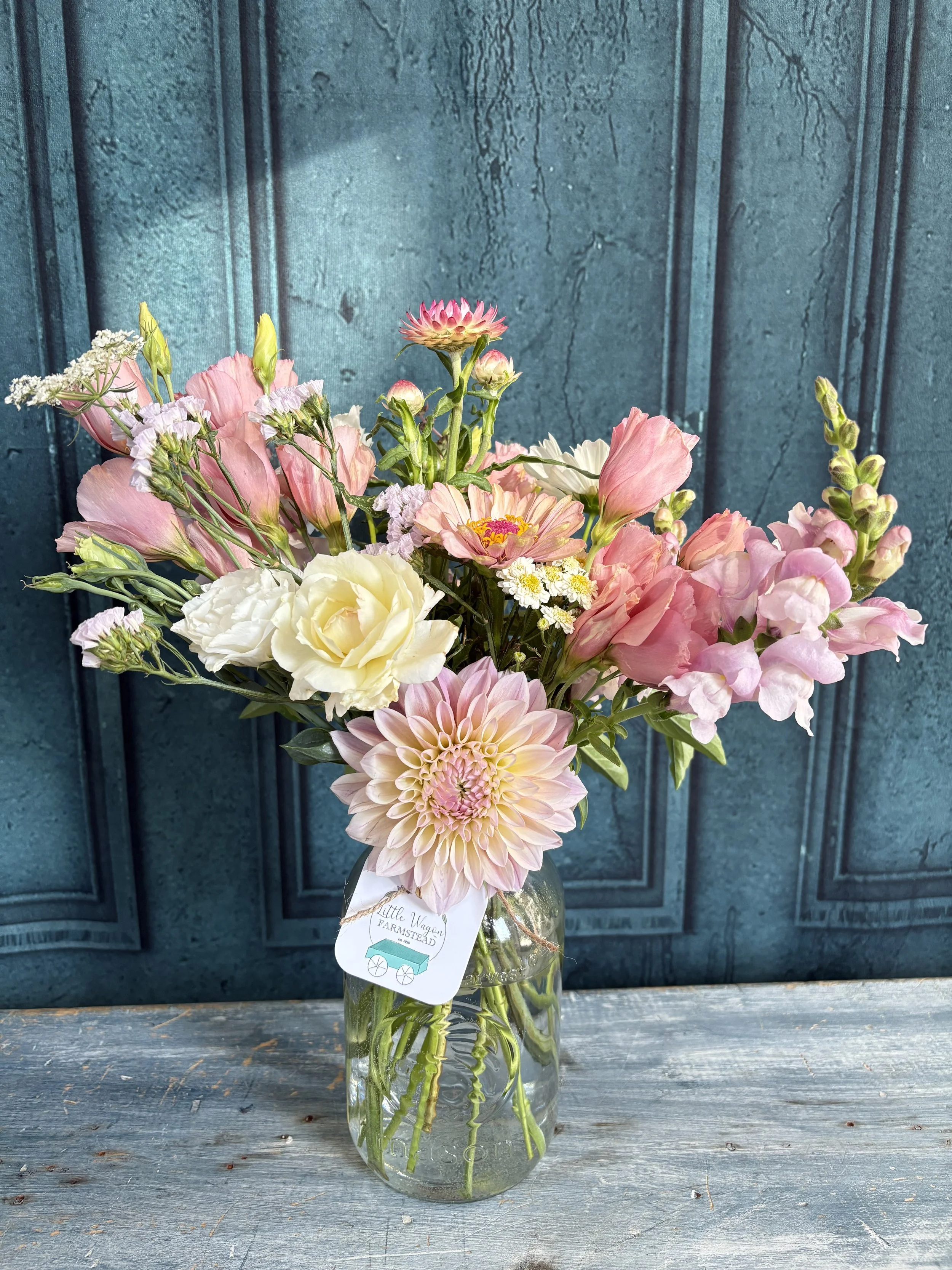 I’m the dreamer behind Little Wagon Farmstead and our Flower Farm. In 2020, my husband and I bought a house with a little land, and a year later I decided to plant flowers, for myself and to give friends. A few years in, I’ve realized that flowers are more than just flowers, they are a smile on someones face, they inspire community, they are a warm feeling every time I walk into a room and see them, they are a conversation piece, and so much more! I started growing flowers for my own home but quickly realized I couldn’t keep such a gift just for myself. I hope I get to hand you a bouquet of your own, so you can experience the joy flowers bring, and fall in love with them too.